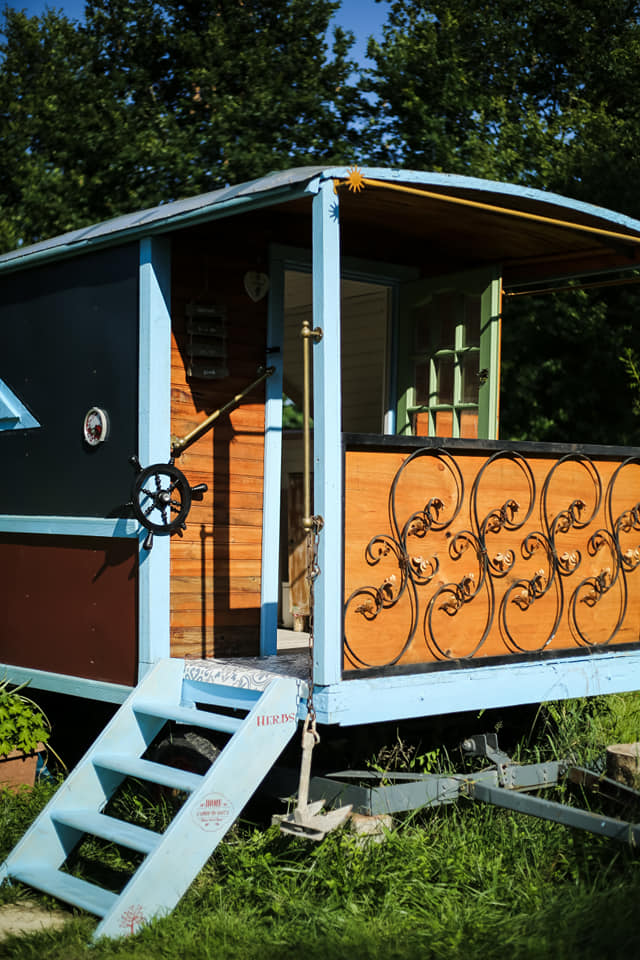 Cette roulotte de 17m2 est posée à l’ombre en bord d’une petite forêt avec vue sur le potager, la forêt, et la prairie. Elle est équipée :