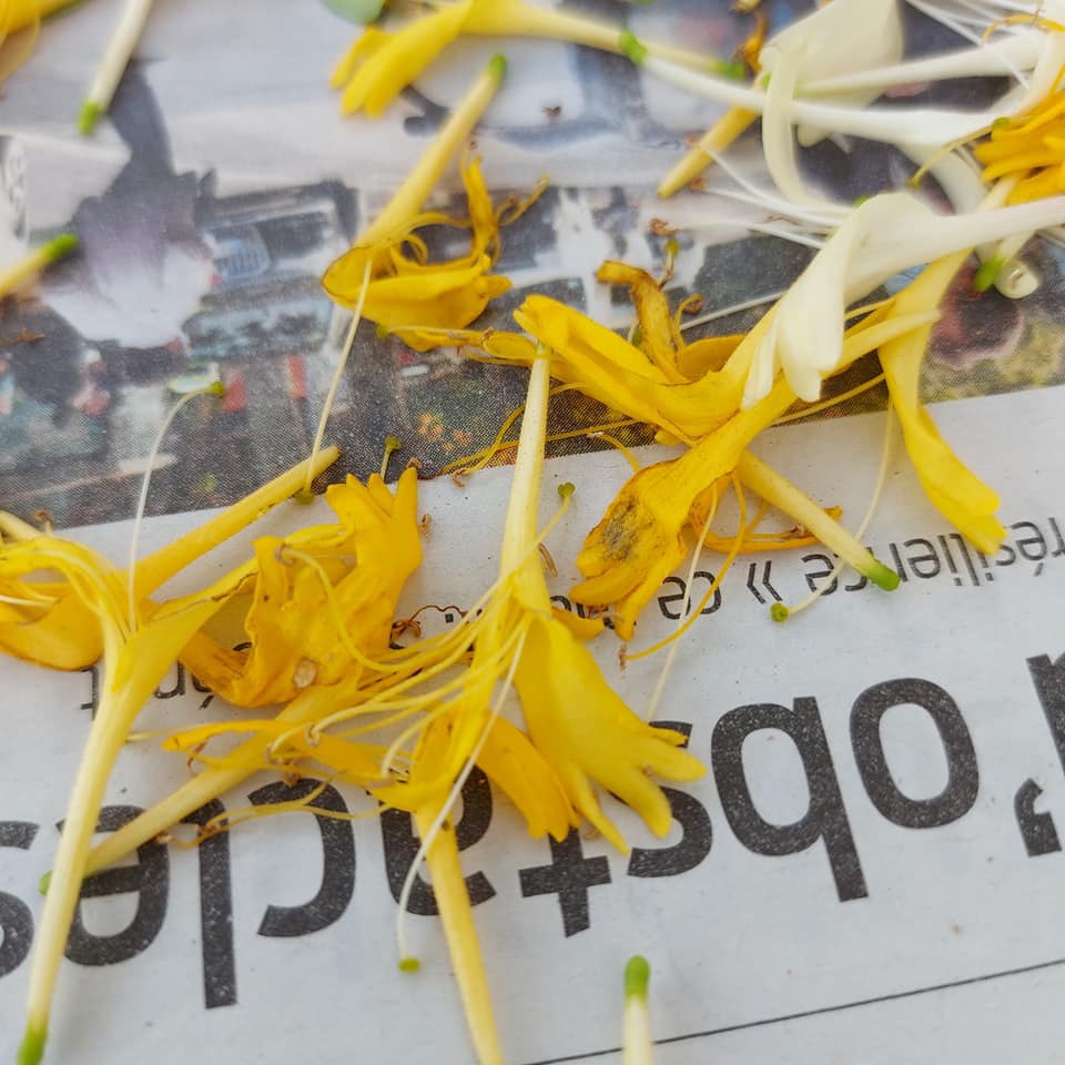 Récolte et séchage des fleurs de chèvrefeuille, feuilles de framboisiers et de vignes pour les infusions de l’année . ![]()